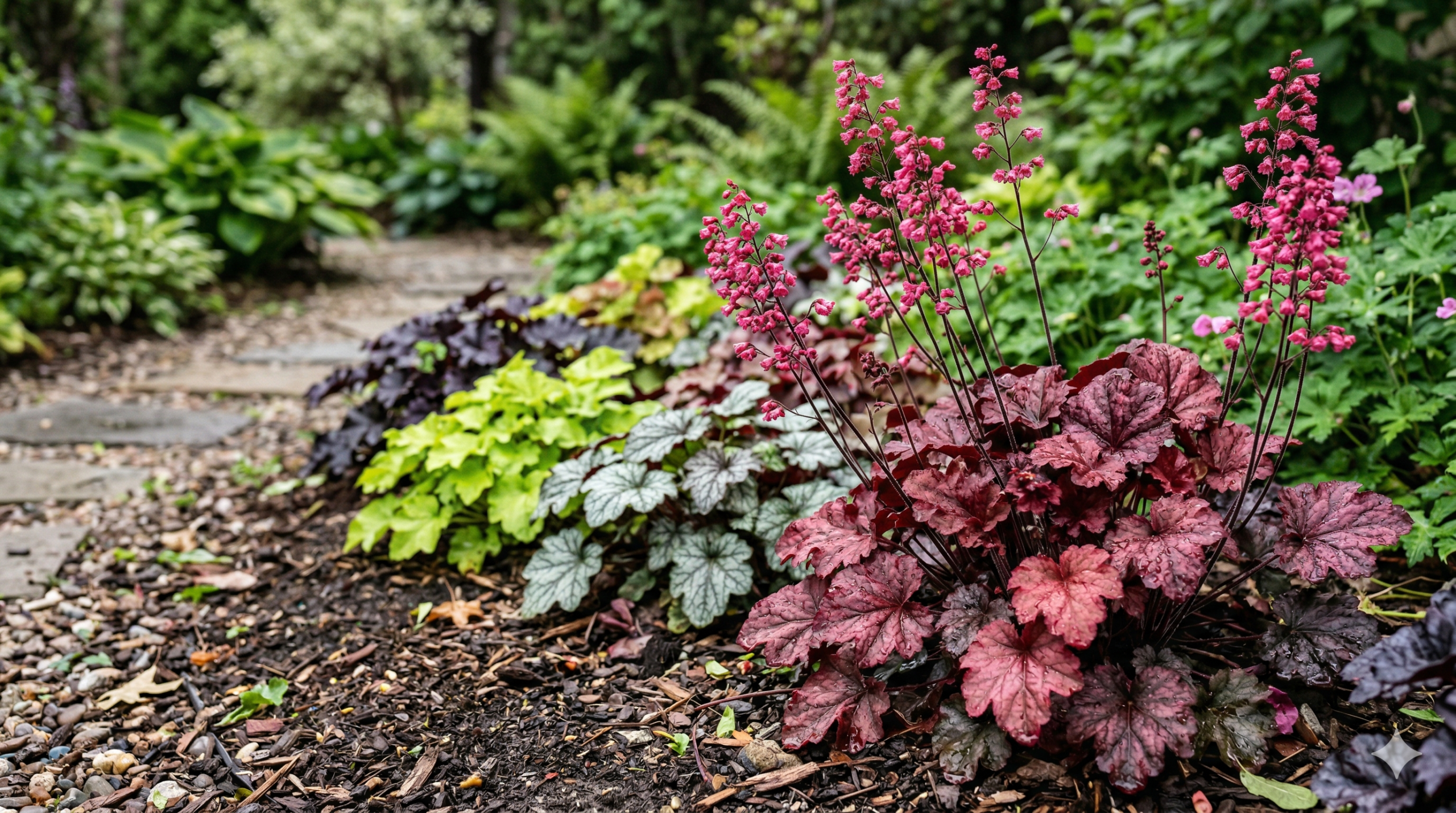- L’heuchère est une vivace facile, décorative et rustique, idéale pour les massifs et les pots.
