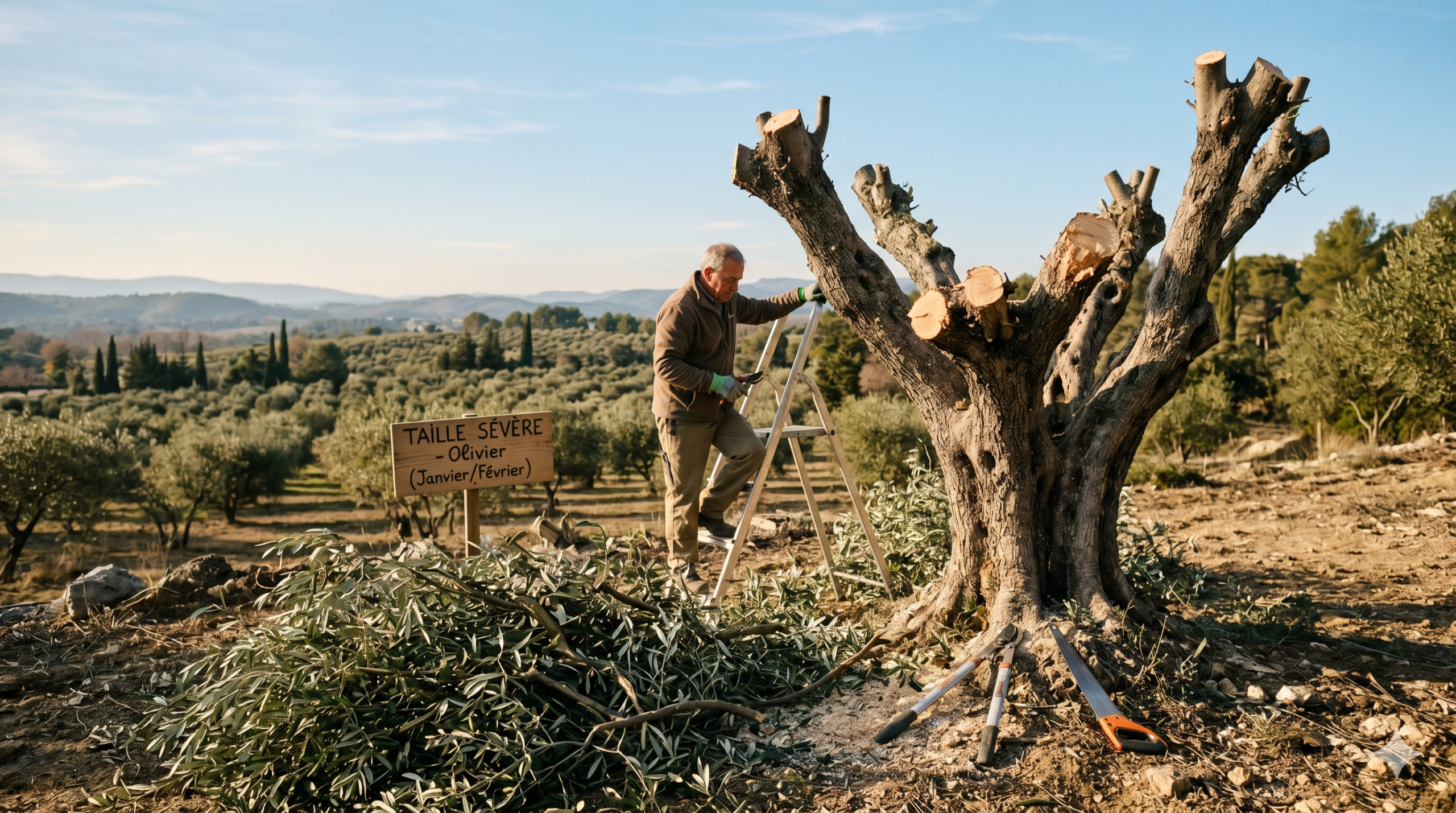 Si votre olivier est très vieux, très dense ou visuellement affaibli, la taille sévère en une seule fois peut le stresser excessivement. Nous vous recommandons alors un rajeunissement progressif sur 2 à 3 ans :