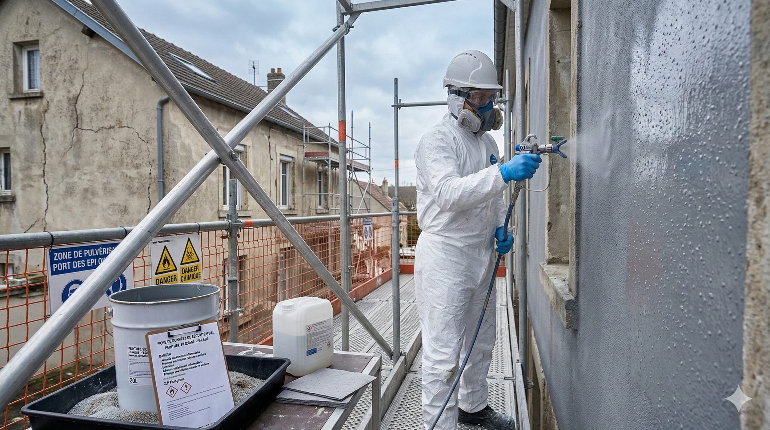 L’application au pistolet airless génère des aérosols contenant des particules de 10 à 100 microns. Ces particules pénètrent facilement dans les voies respiratoires. Travailler en hauteur sur un échafaudage ajoute un facteur de risque mécanique non négligeable. Une chute de 2 mètres représente 95 % des accidents graves de bricolage en hauteur selon l’INRS. Le vent peut disperser les projections à 3–5 mètres du point d’application. Il ne faut jamais appliquer par vent supérieur à force 3 (environ 20 km/h).